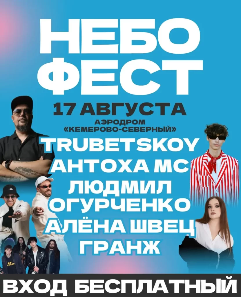 В Кемерове пройдет фестиваль «Небофест-2025» (0+). На сцену выйдут музыканты Антоха МС и Гранж, группы Trubetskoy, «Людмил Огурченко», «Следы» и Pandora Secret. Ранее заявленная певица Алена Швец на фестиваль не приедет.