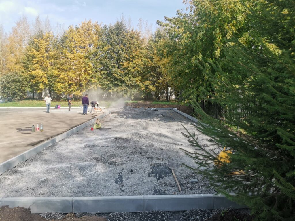 Строители в данный момент устанавливают поребрик, ограждая площадку. Далее начнется устройство основания для прорезиненного покрытия.
