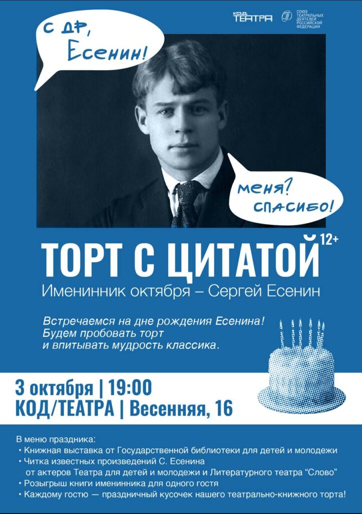 В областном центре пройдет праздник, посвященный дню рождения Сергея Есенина (12+). В программе книжная выставка, читка произведений классика, розыгрыш и торт.