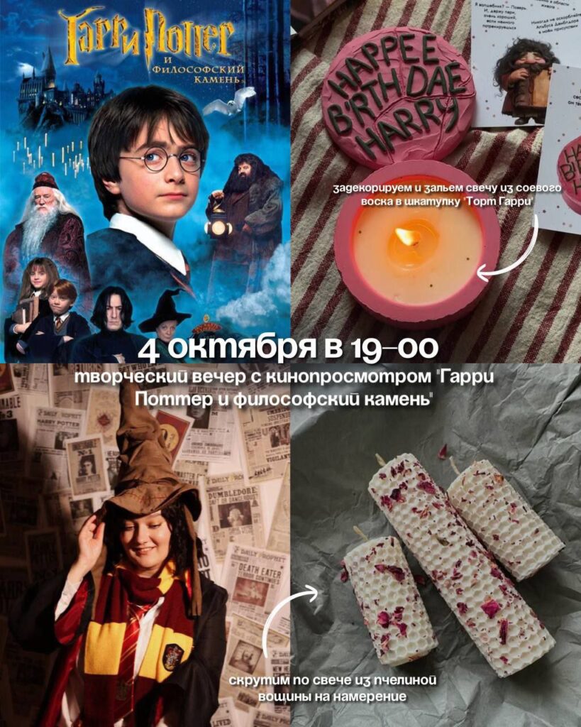 Творческий вечер с просмотром фильма «Гарри Поттер и философский камень» состоится в Кемерове (12+). Гостей научат декорировать шкатулку в стиле торта известного волшебника и заливать ее свечой из натурального соевого воска.
