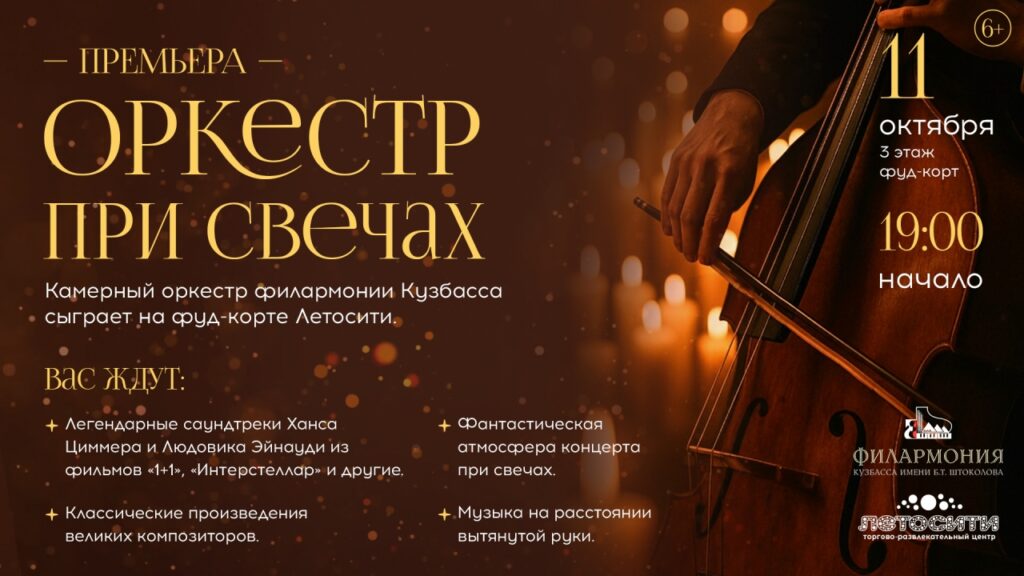 Камерный оркестр филармонии Кузбасса выступит на фуд-корте ТРЦ «Летосити» (6+). Музыканты при свечах представят свое прочтение легендарных саундтреков и классических произведений.