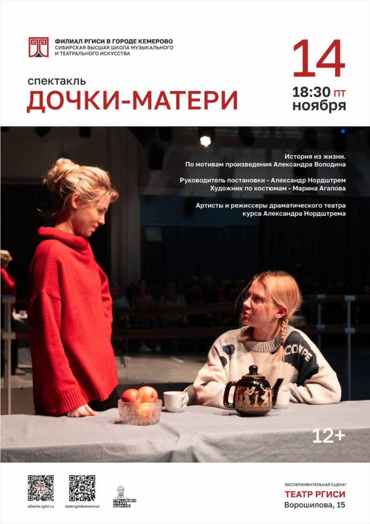 Показ спектакля «Дочки-матери» пройдет в Кемерове (12+). По сюжету главная героиня выросла в детском доме и хочет разыскать свою мать, которую никогда не видела.