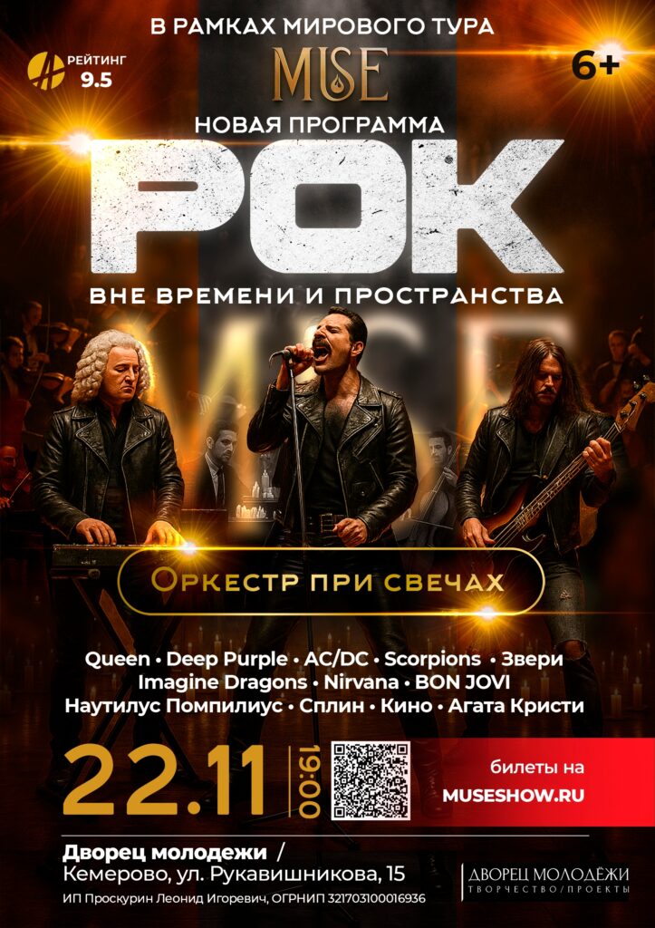 Оркестр MUSE представит жителям столицы Кузбасса новую программу «РОК: вне времени и пространства» (6+). Со сцены прозвучат композиции групп Queen, Scorpions, «Сплин», «Звери» и многих других.