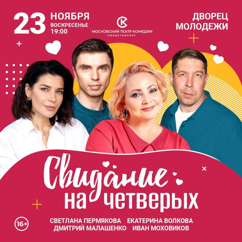 Светлана Пермякова, Екатерина Волкова, Дмитрий Малашенко и Иван Моховиков привезут в Кемерово комедию «Свидание на четверых» (16+).