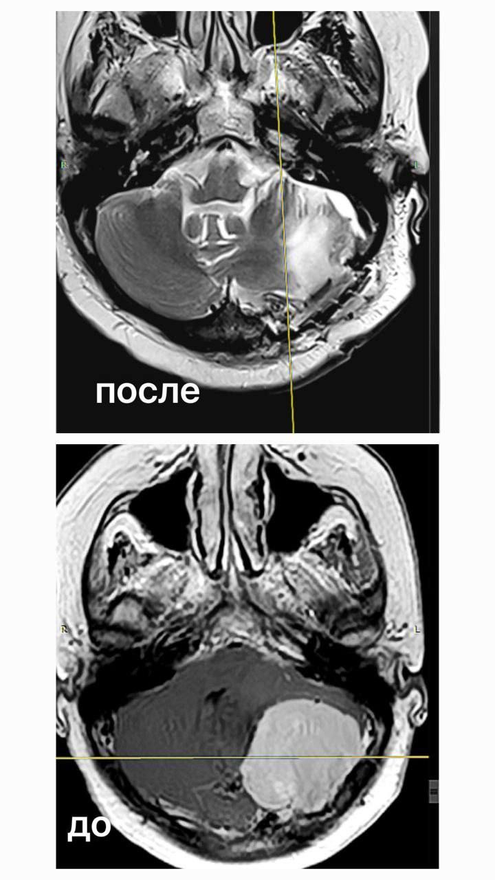 Была проведена магнитно-резонансная томография, которая выявила менингиому. Доброкачественное образование размером пять сантиметров занимало половину задней черепной ямки и сдавливало мозжечок.