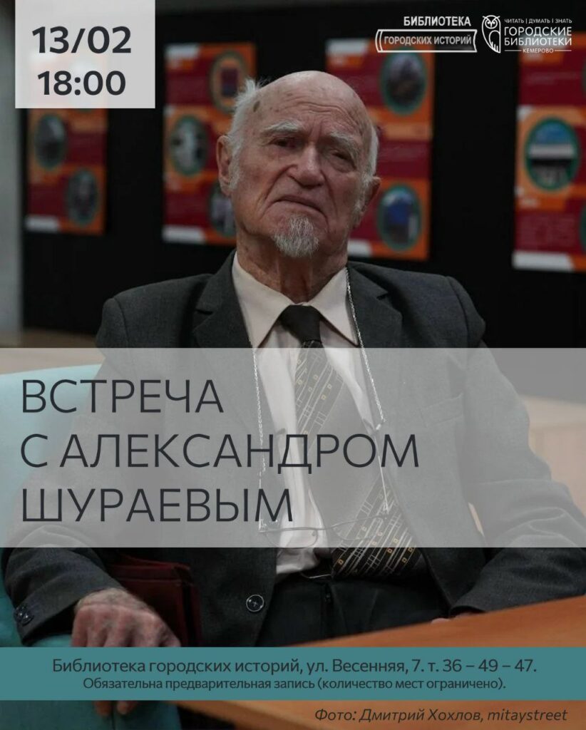Кемеровчане смогут встретиться и пообщаться с Александром Шураевым, заслуженным врачом РСФСР, председателем правления Кемеровского областного отделения Российского союза бывших несовершеннолетних узников фашизма (16+).