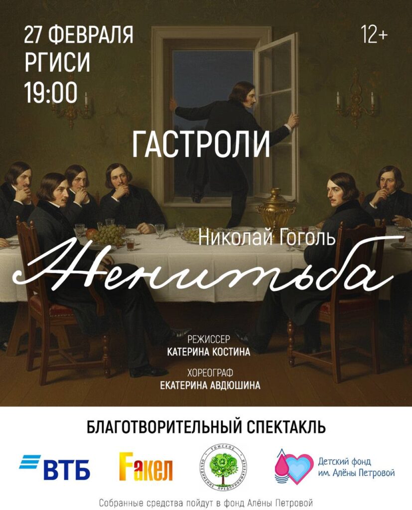 Актеры-любители из Томска выступят в Кемерове с благотворительным спектаклем «Женитьба» по произведению Николая Гоголя (12+). Это комедия о выборе, от которого хочется спрятаться, и о браке, который пугает сильнее одиночества.