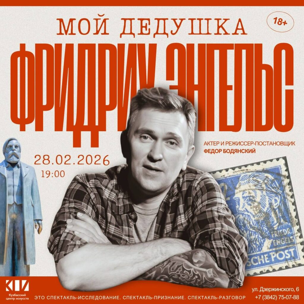Моноспектакль Федора Бодянского «Мой дедушка Фридрих Энгельс» будет представлен в Кемерове (18+). В основу постановки легли дневники, письма, открытки, фотографии и живые воспоминания актёра-автора.