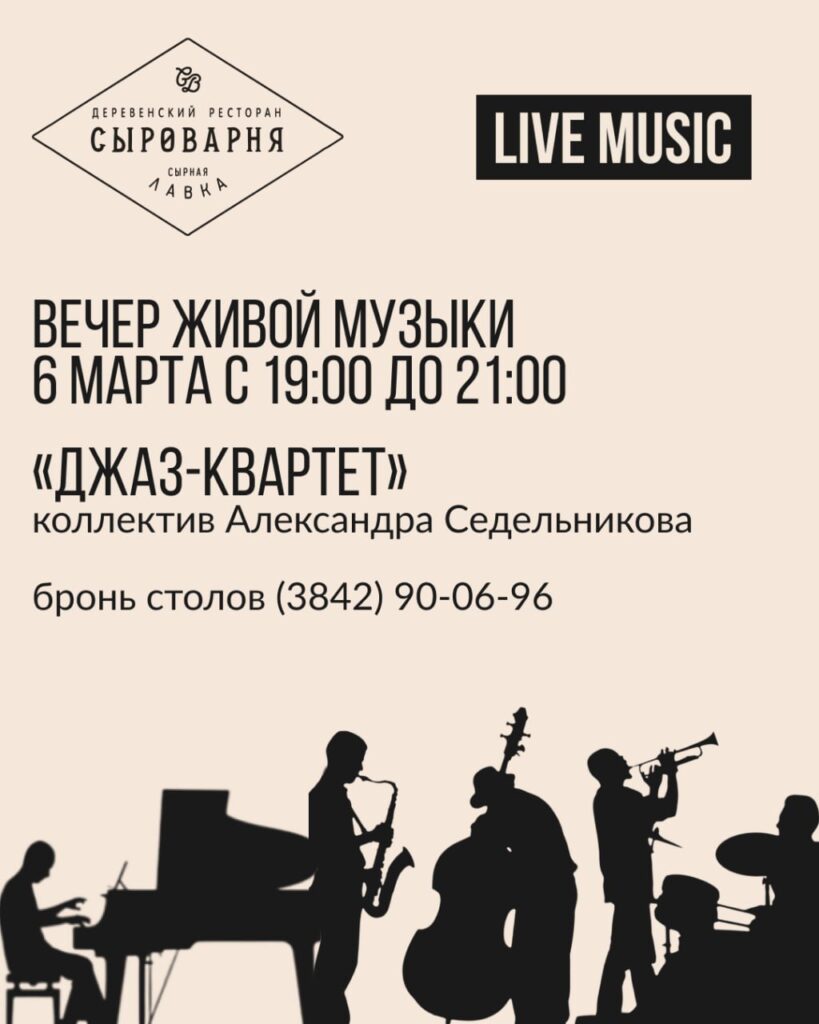 Вечер джазовой музыки пройдет в ресторане «Сыроварня» (18+). Живой звук и ритмы инструментов наполнят зал особым настроением.