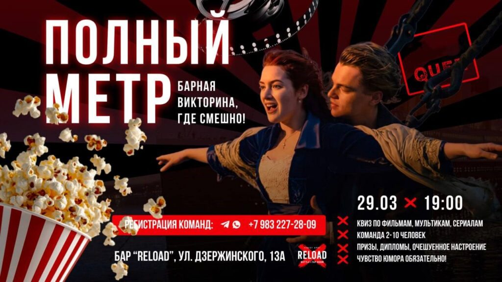 Барная викторина «Полный метр» предлагает гостям ответить на вопросы по фильмам, сериалам и мультфильмам (18+). Хорошая возможность отдохнуть и проверить свою эрудицию.