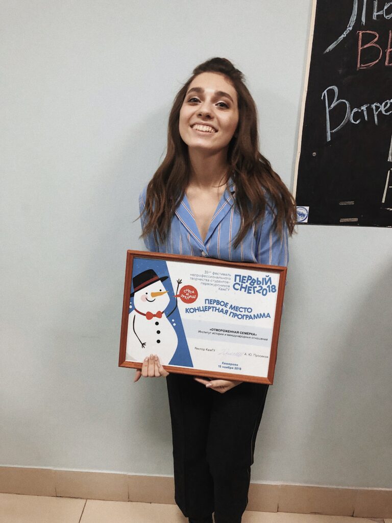 Еще во время учебы в КемГУ я была глубоко погружена в творчество, состояла в студклубе и была руководителем вокального направления. Придумывала номера, в которых участвовала сама и наставляла других. Огромное множество репетиций к концертам, атмосфера закулисья и магия сцены – благодарна за этот опыт университету. На студвесне в выпускной год исполнила сольный номер – песню Strange birds одной из моих любимых артистов Birdy. Я часто ее пела для себя еще с детства, но именно к этому возрасту смогла ее прочувствовать и прожить. Для меня это очень трепетный и символичный момент: на сцене на бэк-вокале подруга, в зале близкие друзья и семья, я исполняю завершающий номер и вот-вот переезжаю в другой город.