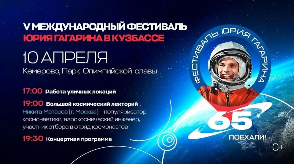 В Кемерове пройдет фестиваль Юрия Гагарина (0+). Гостей ждут театрализованное шоу, выставки, мастер-классы, «Большой космический лекторий» от Никиты Матасова и концерт кавер-группы «Вне правил».