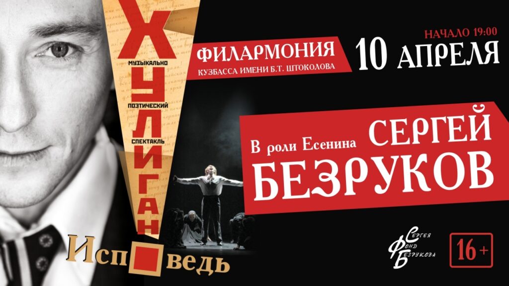 Сергей Безруков представит в Кемерове музыкально-поэтический спектакль «Хулиган. Исповедь» (16+). На нем прозвучат песни на стихи Сергей Есенина и сами стихотворения.