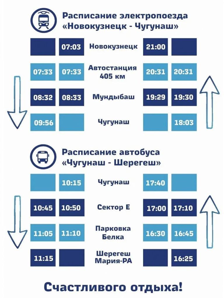 С завтрашнего дня он поедет по маршруту Новокузнецк — Чугунаш — Шерегеш. Туристы в Чугунаше пересядут с поезда на автобус..