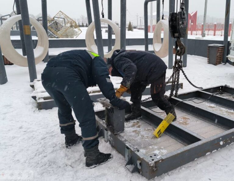 Специалисты начали монтаж моста через линейный каток, который будет открыт всю зиму. Длина металлической конструкции с деревянными ступеньками и ограждениями..