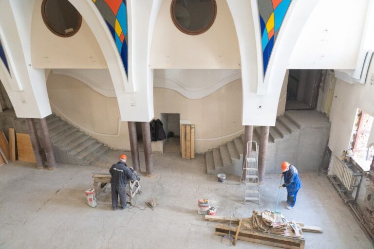 Демонтажные работы близки к завершению. Специалисты сейчас занимаются внутренней отделкой, оштукатуриванием, шпаклевкой и покраской в верхнем ярусе административной части здания..