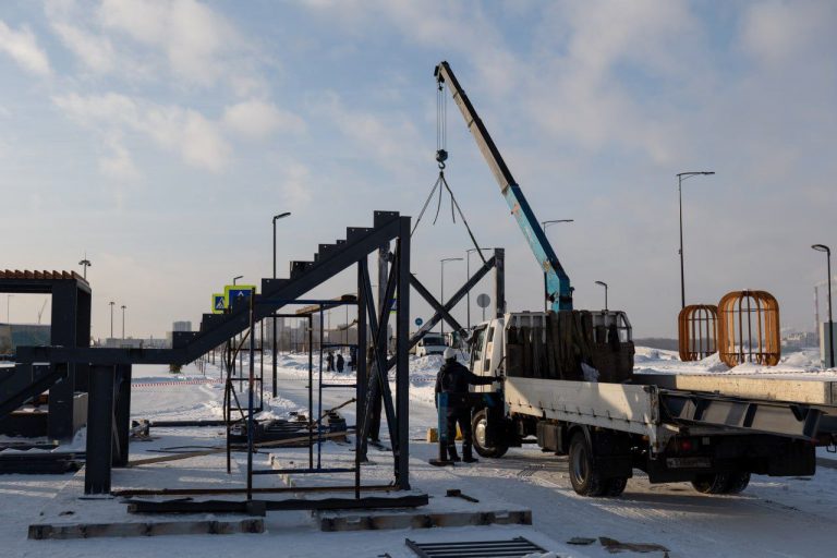Специалисты монтируют 4-метровую конструкцию над линейным катком на новой набережной. Благодаря этому сооружению гости смогут безопасно пройти к смотровой площадке…