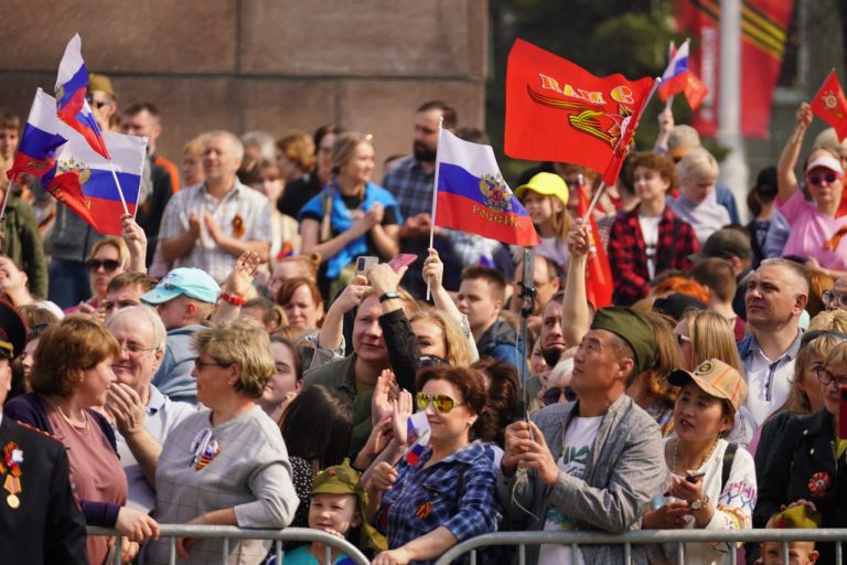 Торжественный марш для жителей и гостей области состоялся на площади Советов. Открыл мероприятие легендарный танк Т-34 с копией Знамени Победы. ..